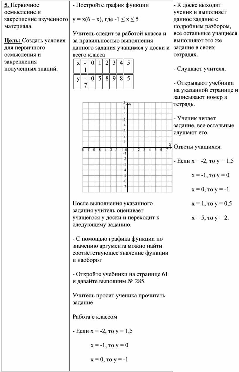 После выполнения указанного задания учитель оценивает учащегося у доски и переходит к следующему заданию. - С помощью графика функции по значению аргумента можно найти соответствующее значение функции и наоборот - Откройте учебники на странице 61 и давайте выполним № 285. Учитель просит ученика прочитать задание Работа с классом - Если х = -2, то у = 1,5 х = -1, то у = 0 х = 0, то у = -1 х = 1, то у = 0,5 х = 5, то у = 2