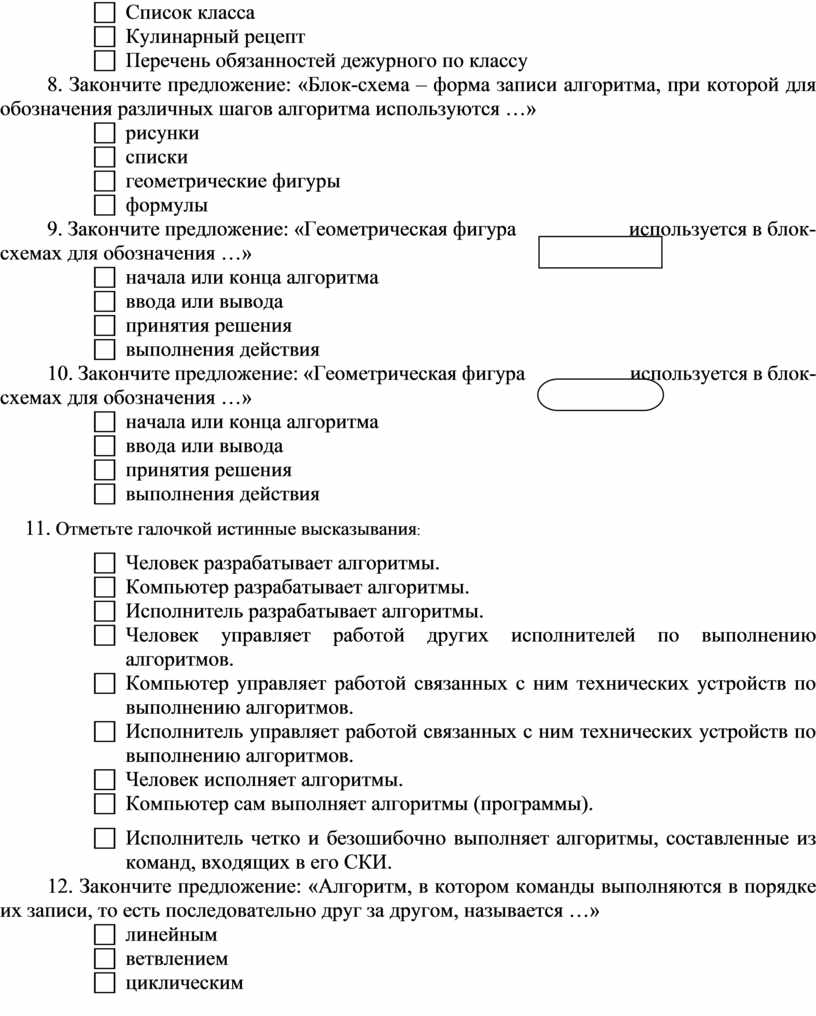8. Закончите предложение: «Блок-схема – форма записи алгоритма, при которой для обозначения различных шагов алгоритма используются …»