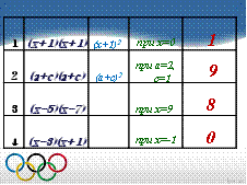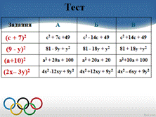 -Считается, что 5 колец – символ пяти континентов: синий – Европа, Черный – Африка, красный – Америка, желтый – Азия, зеленый – Австралия.) -Девиз Олимпийских Игр «Быстрее, выше, сильнее». Этот девиз и будет девизом нашего сегодняшнего урока, тема, которого «Формулы сокращенного умножения».