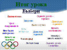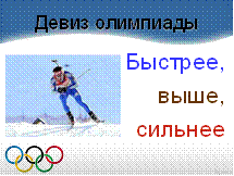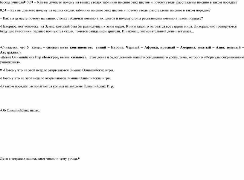 – Как вы думаете почему на ваших столах таблички именно этих цветов и почему столы расставлены именно в таком порядке? -Наверное, нет человека на Земле, который был бы равнодушен к этим играм. К ним задолго готовятся все страны мира. Лихорадочно тренируются будущие участники, заранее волнуются судьи, томятся ожиданием зрители. И наконец, знаменательный день наступает...