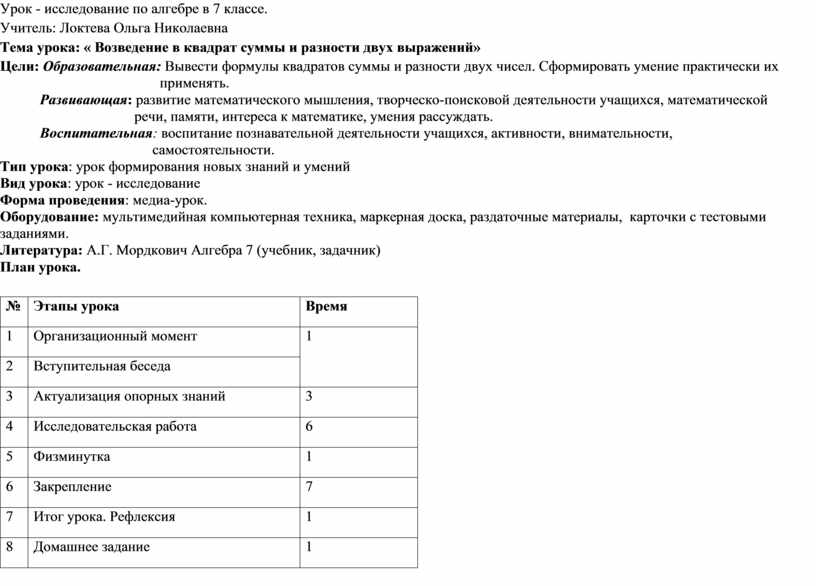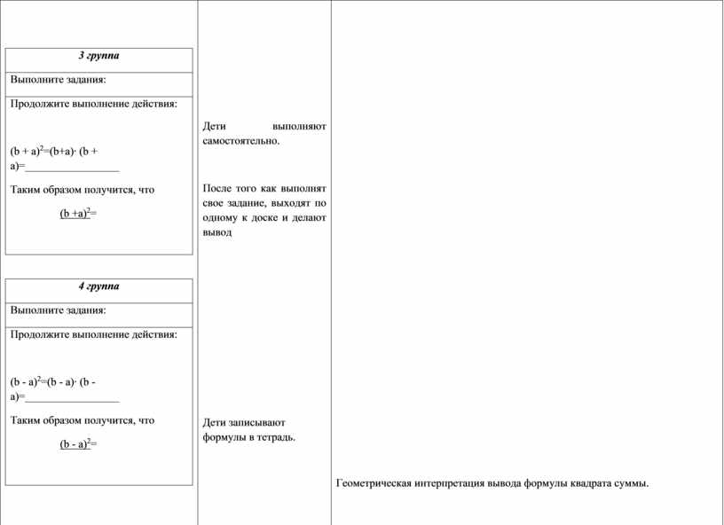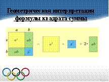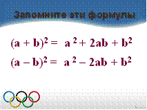 Цели: Образовательная: Вывести формулы квадратов суммы и разности двух чисел. Сформировать умение практически их