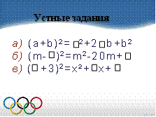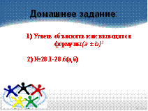 1) Уметь объяснять, как выводятся формулы (а ± b)2. 2) № 28.1-28.6(а,б).