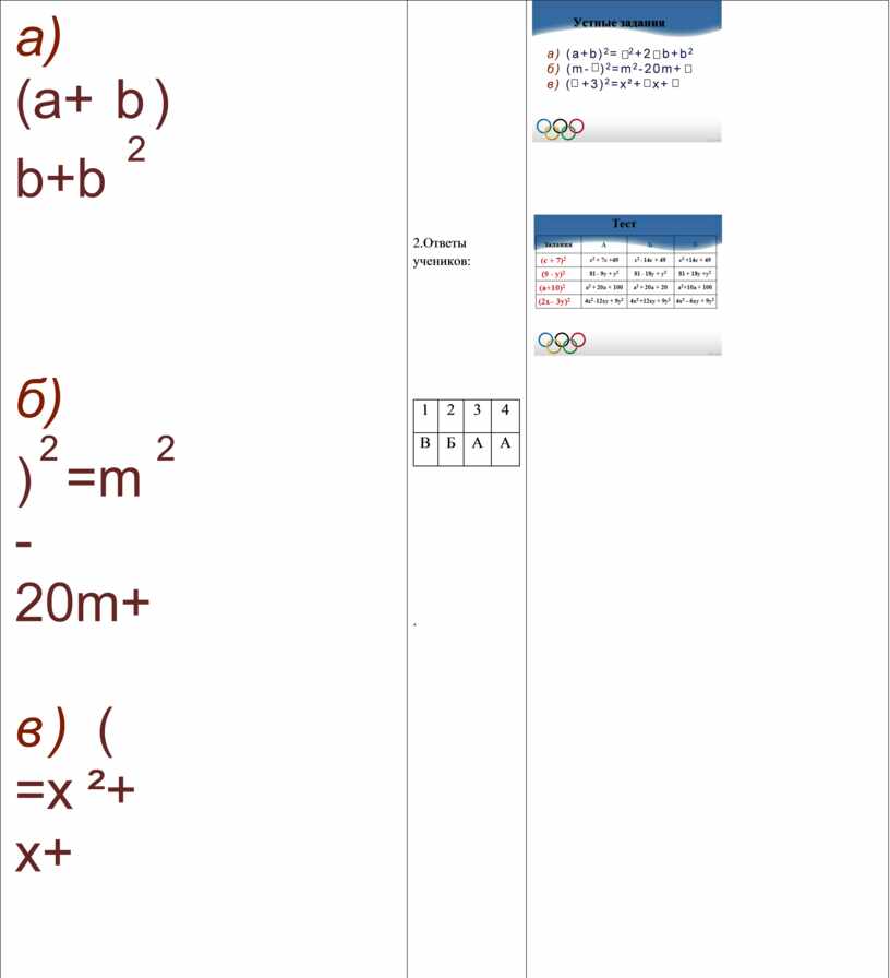 Тема урока: « Возведение в квадрат суммы и разности двух выражений»
