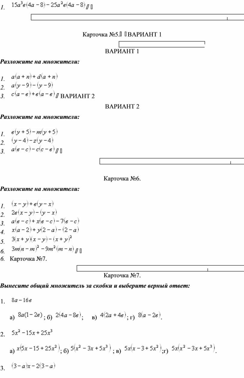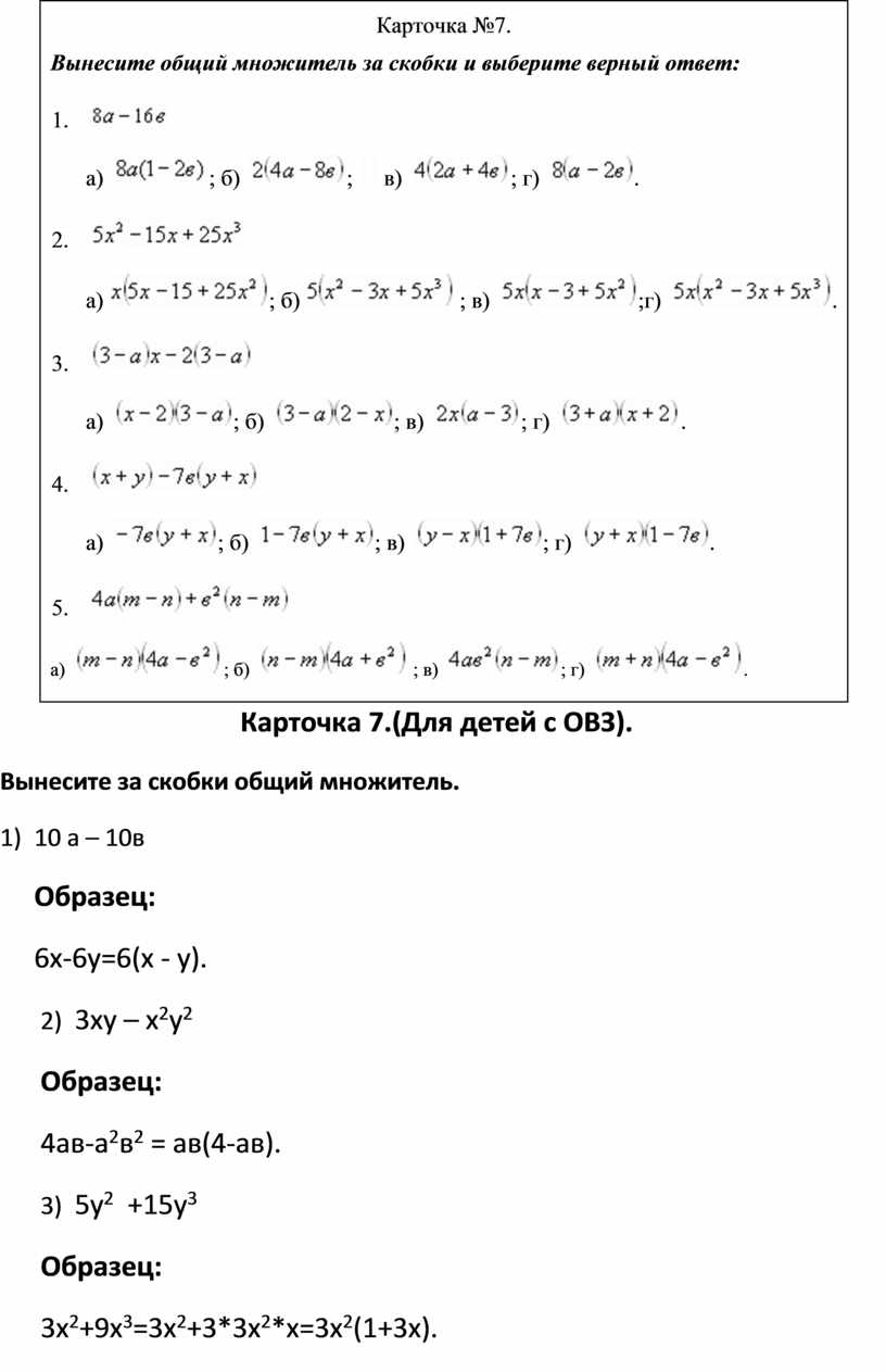 Карточка №7. Вынесите общий множитель за скобки и выберите верный ответ: 1. а) 2. а) 3. а) 4. а) 5. а) |