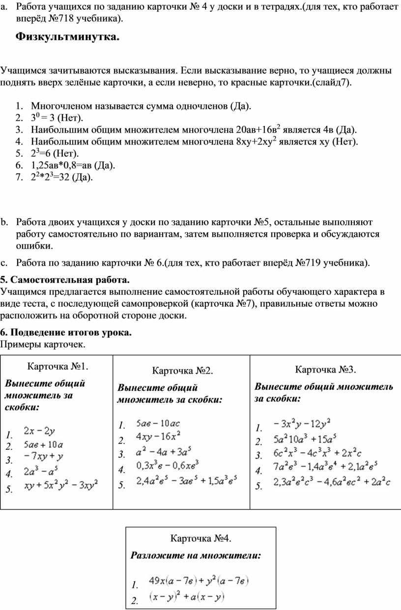 Карточка №2. Вынесите общий множитель за скобки: 1. 2. 3. 4. 5. |