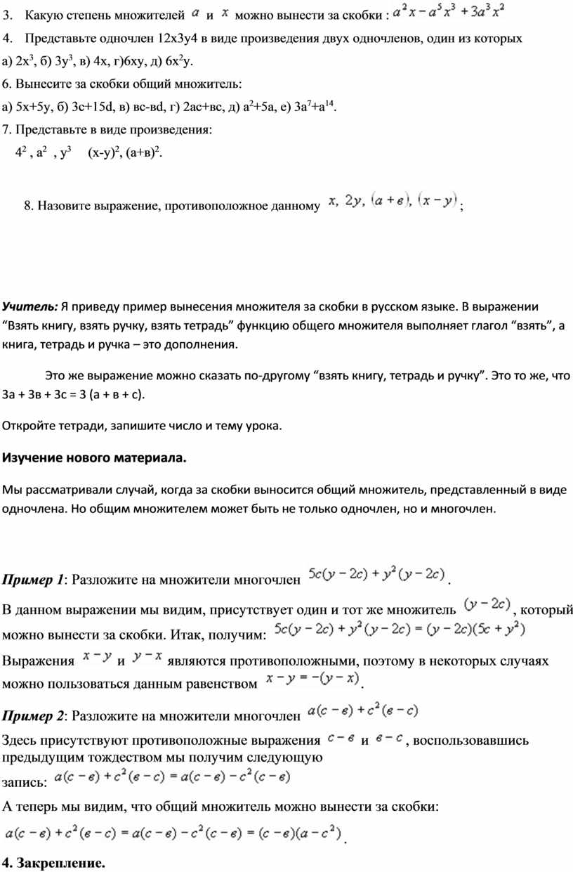 Открытый урок в 7 «В» классе по теме: «Вынесение общего множителя за скобки».