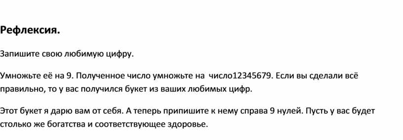Умножьте её на 9. Полученное число умножьте на число12345679. Если вы сделали всё правильно, то у вас получился букет из ваших любимых цифр.