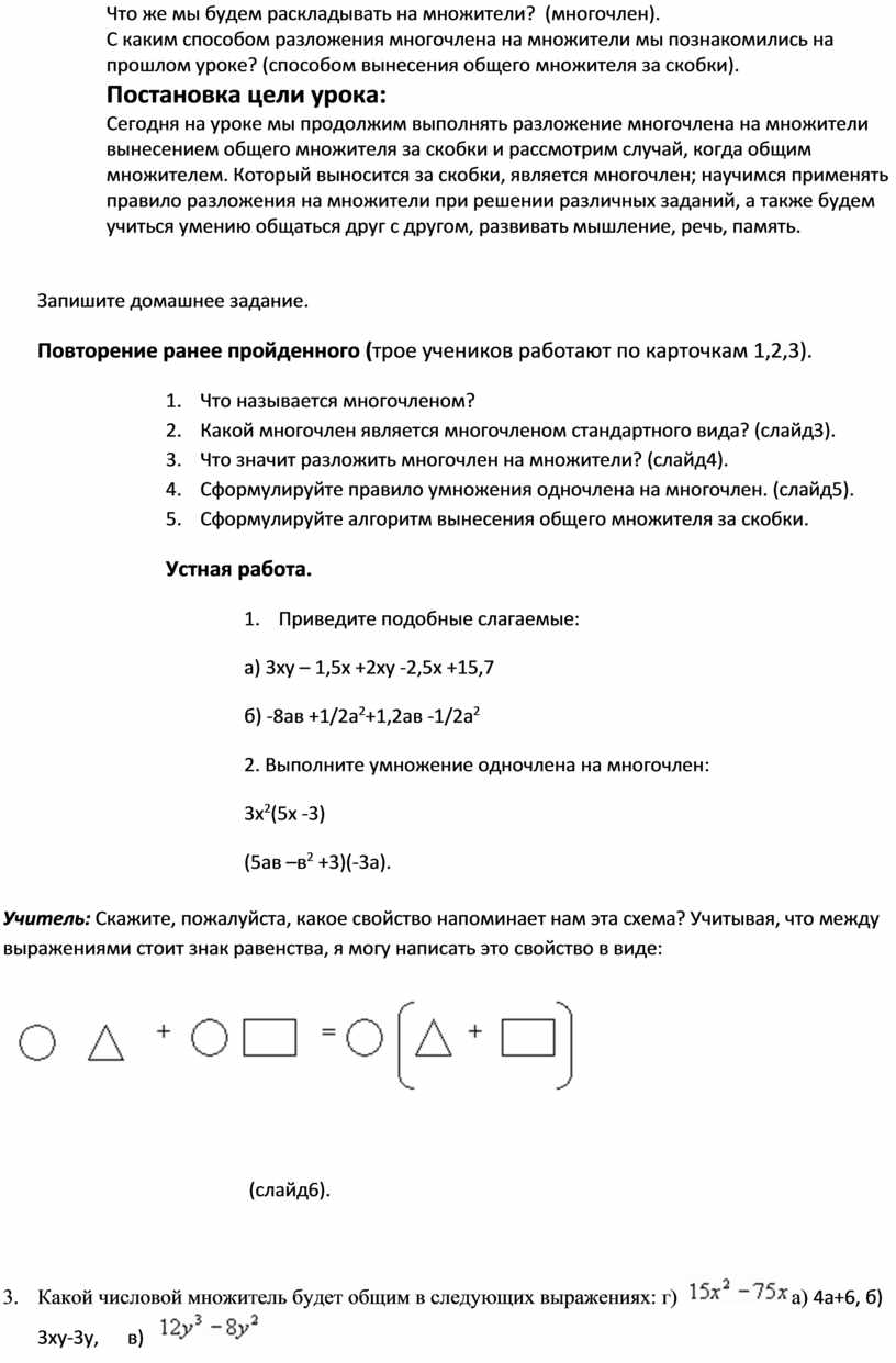 Сегодня на уроке мы продолжим выполнять разложение многочлена на множители вынесением общего множителя за скобки и рассмотрим случай, когда общим множителем. Который выносится за скобки, является многочлен; научимся применять правило разложения на множители при решении различных заданий, а также будем учиться умению общаться друг с другом, развивать мышление, речь, память.