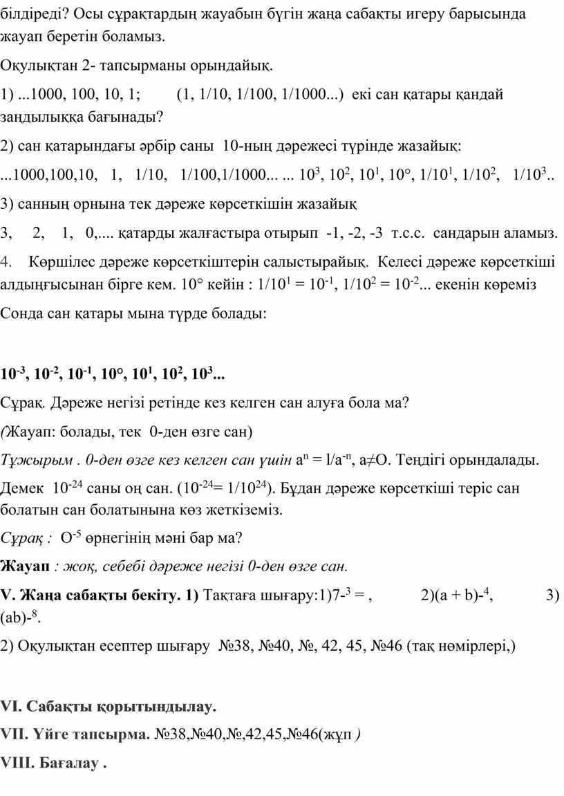 VІІ. Үйге тапсырма. №38,№40,№,42,45,№46(жұп )