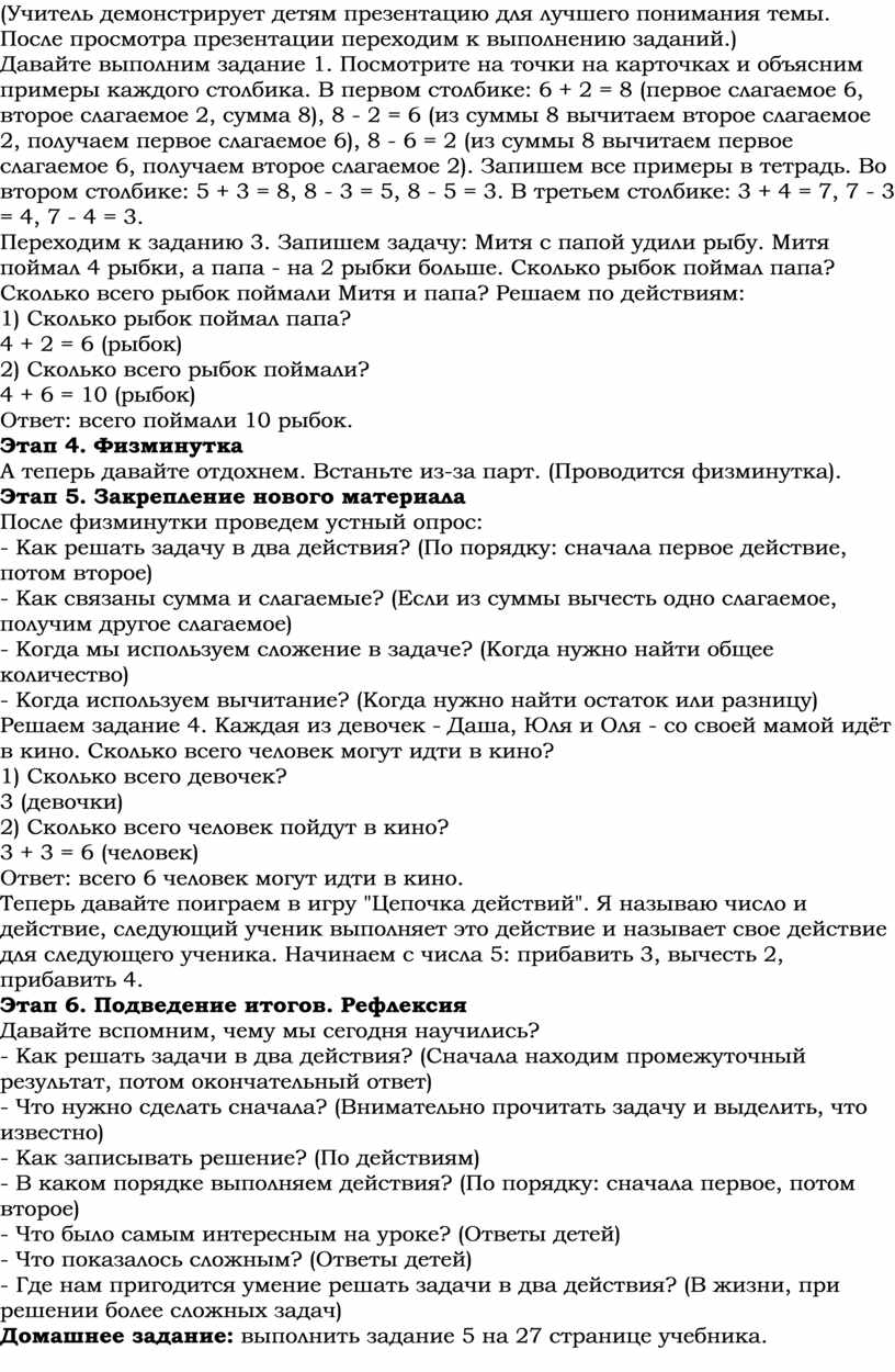 Учитель: Ребята, сегодня мы будем учиться решать задачи в два действия. В таких задачах нужно выполнить два действия, чтобы получить ответ. Сначала мы находим промежуточный результат, а потом с его помощью находим окончательный ответ. При решении таких задач важно помнить связь между суммой и слагаемыми. Если мы знаем сумму и одно слагаемое, то всегда можем найти другое слагаемое, вычитая из суммы известное слагаемое.