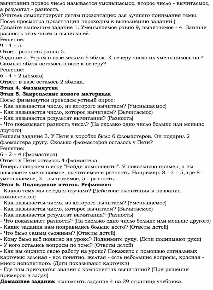Учитель: Ребята, сегодня мы познакомимся с названиями чисел при вычитании. При вычитании мы всегда из большего числа вычитаем меньшее. Например, возьмем пример: 5 - 2 = 3. В этом примере число 5 называется уменьшаемое - это то число, которое мы уменьшаем. Число 2 называется вычитаемое - это то число, которое мы вычитаем. А число 3 - это результат вычитания, его называют разность. То есть разность чисел 5 и 2 равна 3. Запомните: при вычитании первое число называется уменьшаемое, второе число - вычитаемое, а результат - разность.