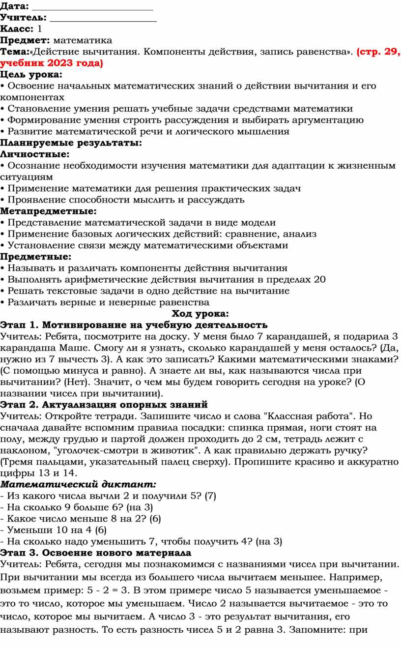 Тема:«Действие вычитания. Компоненты действия, запись равенства». (стр. 29, учебник 2023 года)
