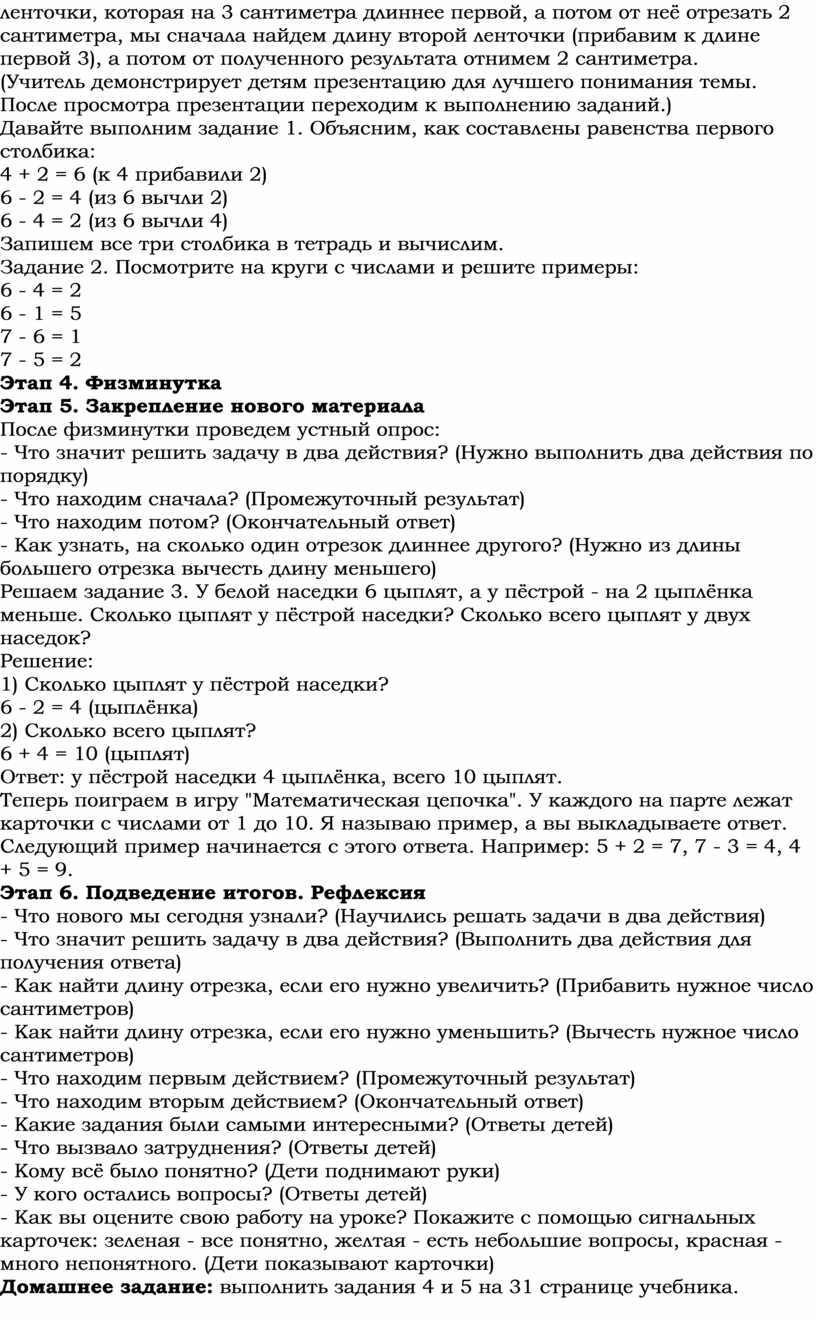 Учитель: Сегодня мы будем учиться решать задачи на увеличение и уменьшение длины в два действия. Что значит решить задачу в два действия? Это значит, что для получения ответа нам нужно выполнить два действия по порядку. Сначала мы находим промежуточный результат, а потом с его помощью находим окончательный ответ. Например, если нам нужно узнать длину ленточки, которая на 3 сантиметра длиннее первой, а потом от неё отрезать 2 сантиметра, мы сначала найдем длину второй ленточки (прибавим к длине первой 3), а потом от полученного результата отнимем 2 сантиметра.