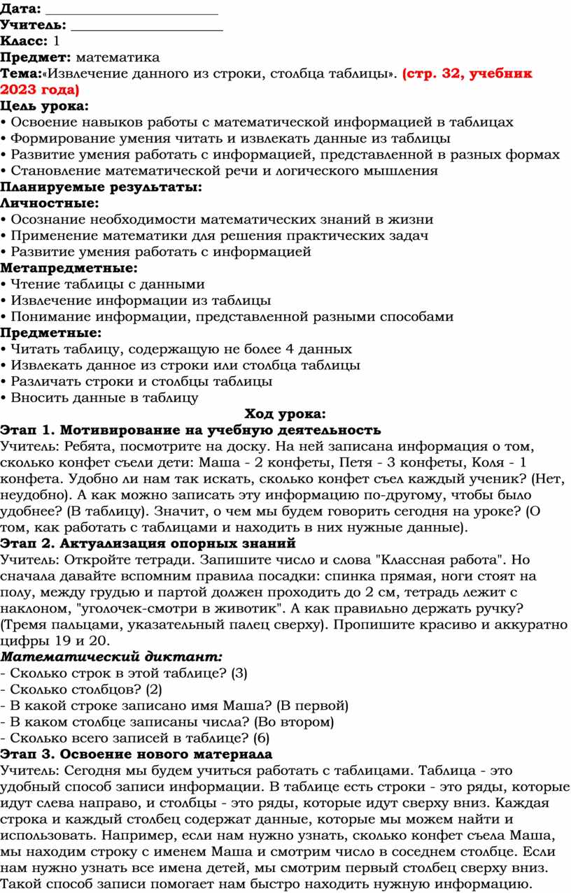 Учитель: Сегодня мы будем учиться работать с таблицами. Таблица - это удобный способ записи информации. В таблице есть строки - это ряды, которые идут слева направо, и столбцы - это ряды, которые идут сверху вниз. Каждая строка и каждый столбец содержат данные, которые мы можем найти и использовать. Например, если нам нужно узнать, сколько конфет съела Маша, мы находим строку с именем Маша и смотрим число в соседнем столбце. Если нам нужно узнать все имена детей, мы смотрим первый столбец сверху вниз. Такой способ записи помогает нам быстро находить нужную информацию.