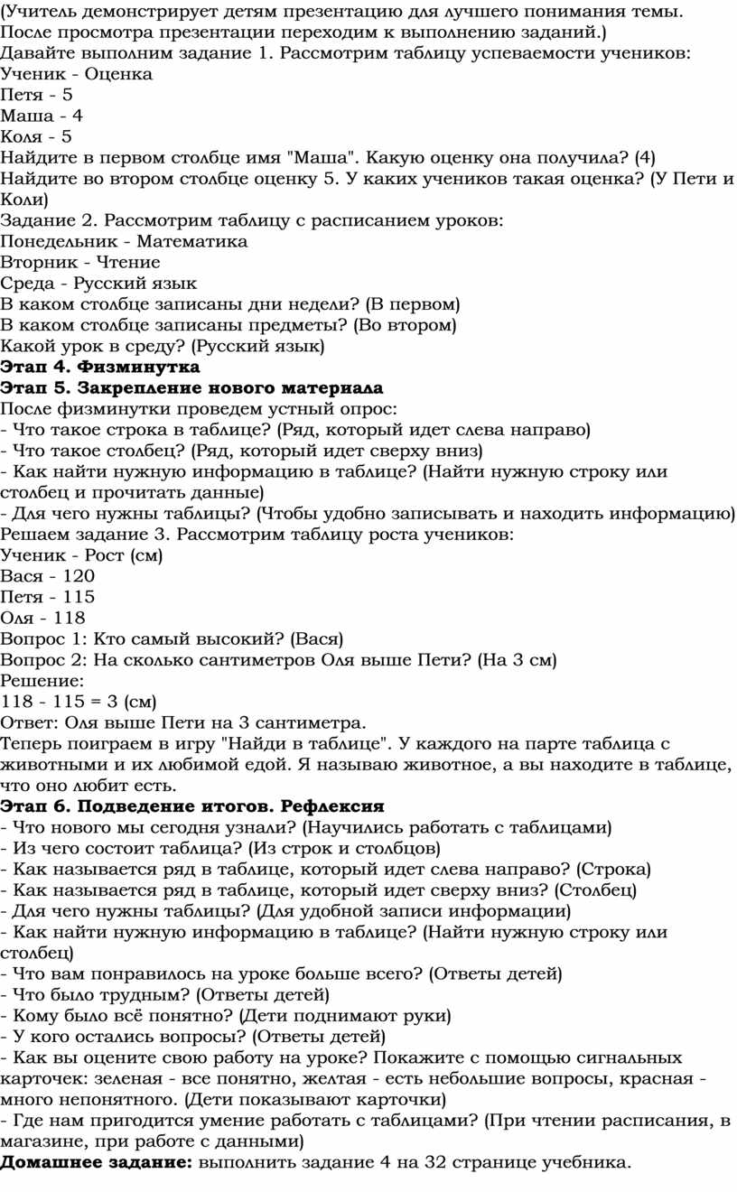 • Формирование умения читать и извлекать данные из таблицы