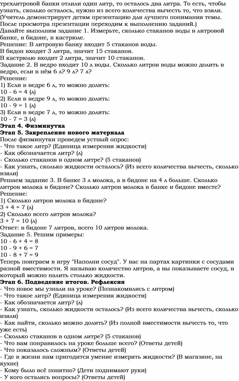 Учитель: Ребята, у меня есть пакет молока и бутылка воды. Как вы думаете, где жидкости больше? (В пакете молока). Как это можно проверить? (Нужно измерить количество жидкости). В каких единицах измеряется количество жидкости? (В литрах). А если в задаче сказано, что из бутылки выпили 2 стакана, как узнать, сколько осталось? (Нужно из всего количества вычесть 2 стакана). Значит, о чем мы будем говорить сегодня на уроке? (О литре и решении задач с жидкостями).