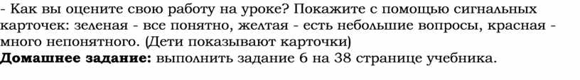 - Как вы оцените свою работу на уроке? Покажите с помощью сигнальных карточек: зеленая - все понятно, желтая - есть небольшие вопросы, красная - много непонятного. (Дети показывают карточки)
