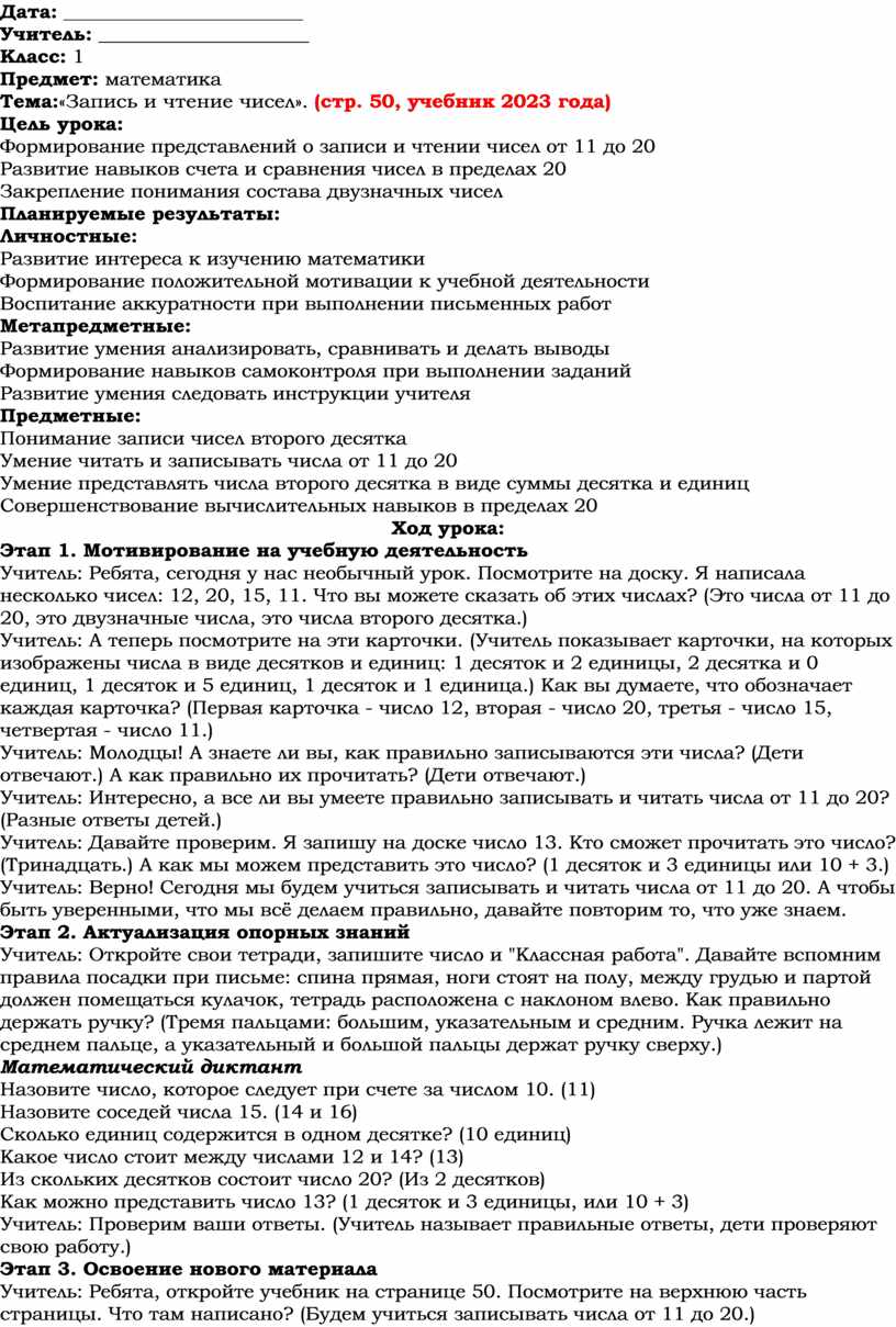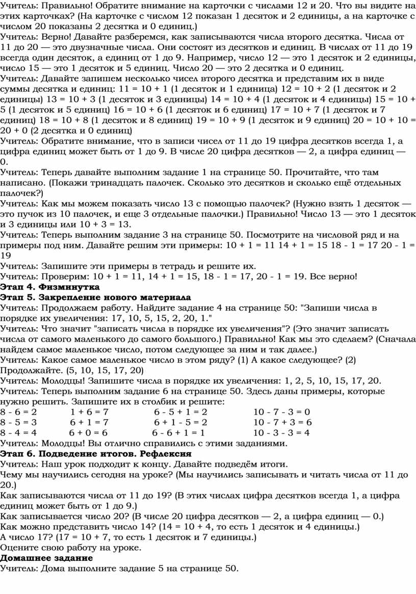 Учитель: Ребята, откройте учебник на странице 50. Посмотрите на верхнюю часть страницы. Что там написано? (Будем учиться записывать числа от 11 до 20.)