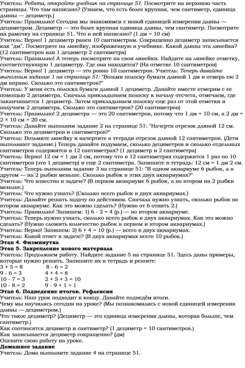 Учитель: Правильно! Сегодня мы знакомимся с новой единицей измерения длины — дециметром. Дециметр — это более крупная единица длины, чем сантиметр. Посмотрите на рамочку на странице 51. Что в ней написано? (1 дм = 10 см)