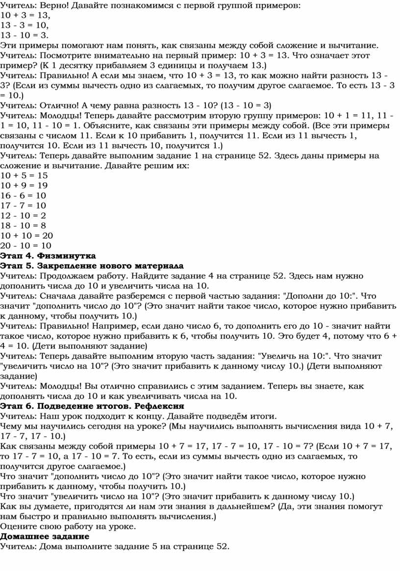 Учитель: Ребята, откройте учебник на странице 52. Посмотрите на верхнюю часть страницы. Что там написано? (Будем учиться выполнять вычисления вида: 10 + 7, 17 - 7, 17 - 10.)