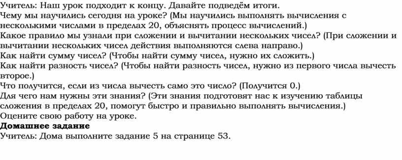 Освоение приемов сложения и вычитания нескольких чисел в пределах 20