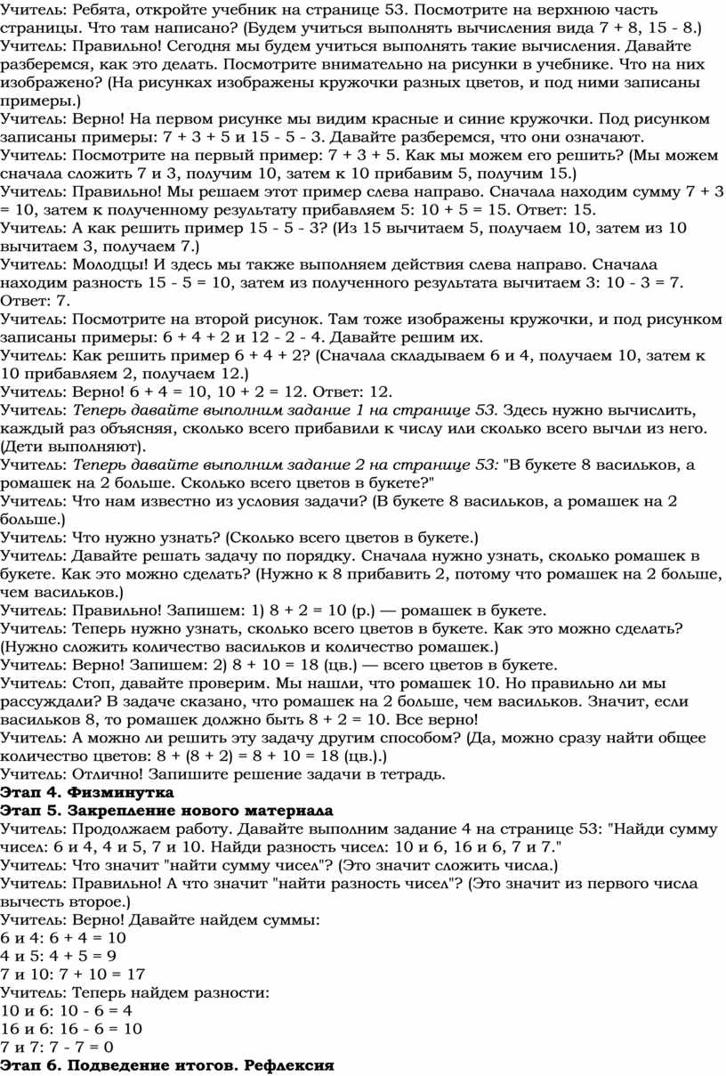Учитель: Ребята, откройте учебник на странице 53. Посмотрите на верхнюю часть страницы. Что там написано? (Будем учиться выполнять вычисления вида 7 + 8, 15 - 8.)
