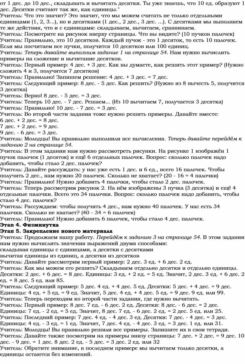 Учитель: Правильно! Сегодня мы будем учиться считать десятками. Давайте внимательно прочитаем информацию, которая дана в учебнике: "Будем учиться вести счёт десятками: от 1 дес. до 10 дес., складывать и вычитать десятки. Ты уже знаешь, что 10 ед. образуют 1 дес. Десятки считают так же, как единицы."