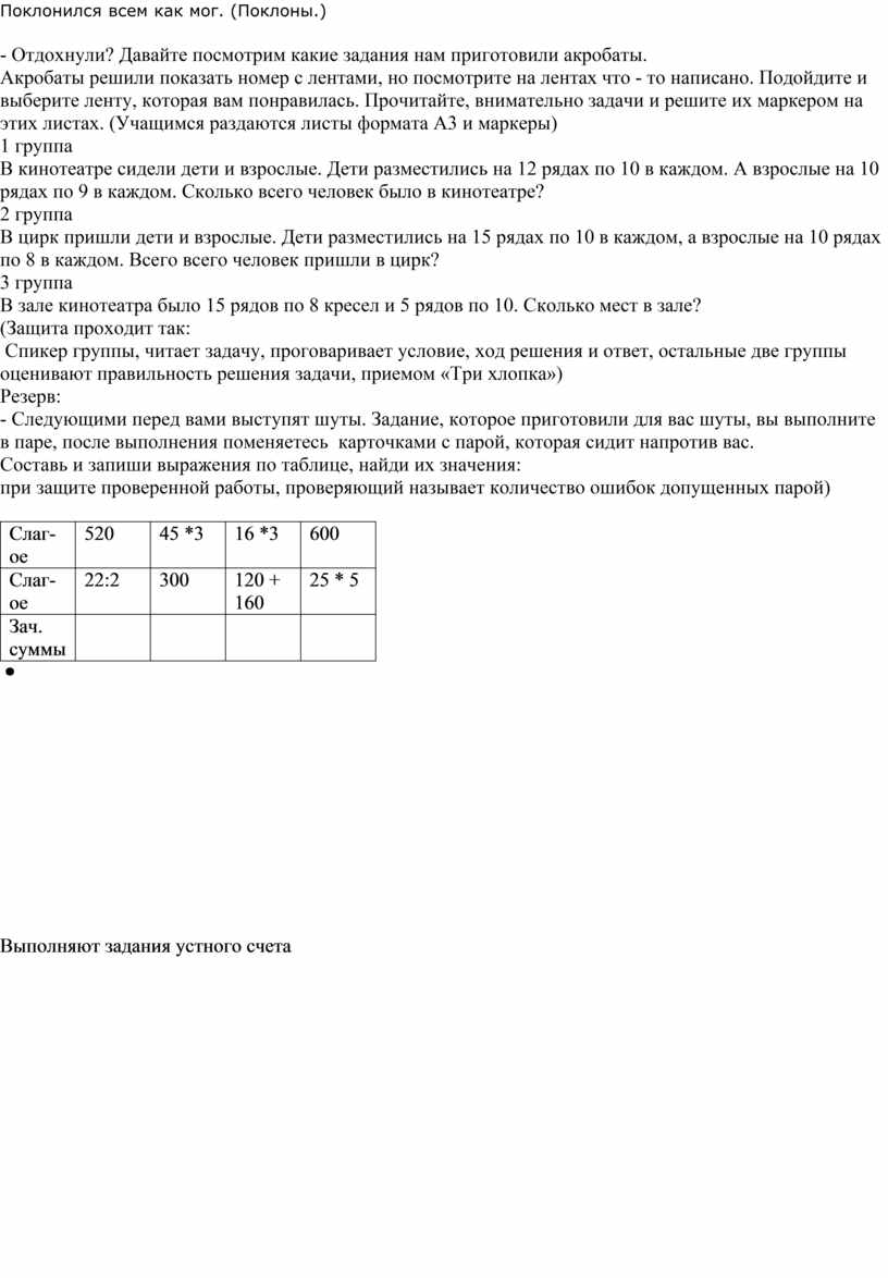 Физ. Минутка музыкальная Вышел клоун на арену, Поклонился всем со сцены, Вправо, влево и вперед... Поклонился всем как мог. (Поклоны.) - Отдохнули? Давайте посмотрим какие задания нам приготовили акробаты. Акробаты решили показать номер с лентами, но посмотрите на лентах что - то написано. Подойдите и выберите ленту, которая вам понравилась. Прочитайте, внимательно задачи и решите их маркером на этих листах. (Учащимся раздаются листы формата А3 и маркеры) 1 группа В кинотеатре сидели дети и взрослые. Дети разместились на 12 рядах по 10 в каждом. А взрослые на 10 рядах по 9 в каждом. Сколько всего человек было в кинотеатре? 2 группа В цирк пришли дети и взрослые. Дети разместились на 15 рядах по 10 в каждом, а взрослые на 10 рядах по 8 в каждом. Всего всего человек пришли в цирк? 3 группа В зале кинотеатра было 15 рядов по 8 кресел и 5 рядов по 10. Сколько мест в зале? (Защита проходит так: Спикер группы, читает задачу, проговаривает условие, ход решения и ответ, остальные две группы оценивают правильность решения задачи, приемом «Три хлопка») Резерв: - Следующими перед вами выступят шуты. Задание, которое приготовили для вас шуты, вы выполните в паре, после выполнения поменяетесь карточками с парой, которая сидит напротив вас. Составь и запиши выражения по таблице, найди их значения: при защите проверенной работы, проверяющий называет количество ошибок допущенных парой)