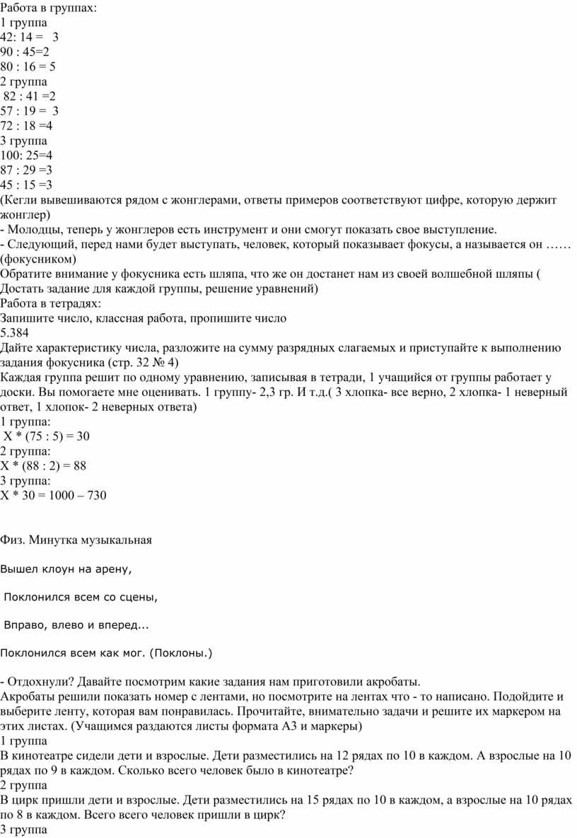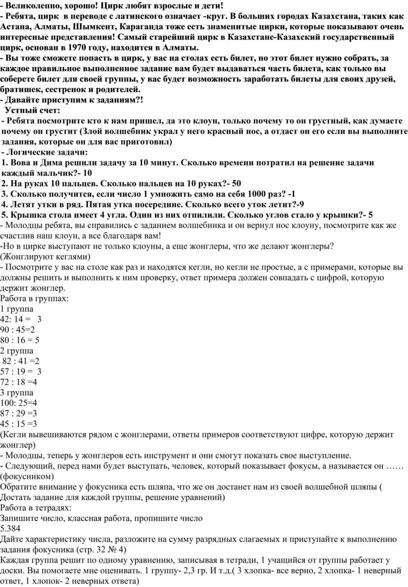 - А кто из вас, хоть один раз был в цирке? - Великолепно, хорошо! Цирк любят взрослые и дети! - Ребята, цирк в переводе с латинского означает -круг. В больших городах Казахстана, таких как Астана, Алматы, Шымкент, Караганда тоже есть знаменитые цирки, которые показывают очень интересные представления! Самый старейший цирк в Казахстане-Казахский государственный цирк, основан в 1970 году, находится в Алматы. - Вы тоже сможете попасть в цирк, у вас на столах есть билет, но этот билет нужно собрать, за каждое правильное выполненное задание вам будет выдаваться часть билета, как только вы соберете билет для своей группы, у вас будет возможность заработать билеты для своих друзей, братишек, сестренок и родителей. - Давайте приступим к заданиям?! Устный счет: - Ребята посмотрите кто к нам пришел, да это клоун, только почему то он грустный, как думаете почему он грустит (Злой волшебник украл у него красный нос, а отдаст он его если вы выполните задания, которые он для вас приготовил) - Логические задачи: 1. Вова и Дима решили задачу за 10 минут. Сколько времени потратил на решение задачи каждый мальчик?- 10 2. На руках 10 пальцев. Сколько пальцев на 10 руках?- 50 3. Сколько получится, если число 1 умножить само на себя 1000 раз? -1 4. Летят утки в ряд. Пятая утка посередине. Сколько всего уток летит?-9 5. Крышка стола имеет 4 угла. Один из них отпилили. Сколько углов стало у крышки?- 5 - Молодцы ребята, вы справились с заданием волшебника и он вернул нос клоуну, посмотрите как же счастлив наш клоун, а все благодаря вам! -Но в цирке выступают не только клоуны, а еще жонглеры, что же делают жонглеры? (Жонглируют кеглями) - Посмотрите у вас на столе как раз и находятся кегли, но кегли не простые, а с примерами, которые вы должны решить и выполнить к ним проверку, ответ примера должен совпадать с цифрой, которую держит жонглер. Работа в группах: 1 группа 42: 14 = 3 90 : 45=2 80 : 16 = 5 2 группа 82 : 41 =2 57 : 19 = 3 72 : 18 =4 3 группа 100: 25=4 87 : 29 =3 45 : 15 =3 (Кегли вывешиваются рядом с жонглерами, ответы примеров соответствуют цифре, которую держит жонглер) - Молодцы, теперь у жонглеров есть инструмент и они смогут показать свое выступление. - Следующий, перед нами будет выступать, человек, который показывает фокусы, а называется он …… (фокусником) Обратите внимание у фокусника есть шляпа, что же он достанет нам из своей волшебной шляпы ( Достать задание для каждой группы, решение уравнений) Работа в тетрадях: Запишите число, классная работа, пропишите число 5.384 Дайте характеристику числа, разложите на сумму разрядных слагаемых и приступайте к выполнению задания фокусника (стр. 32 № 4) Каждая группа решит по одному уравнению, записывая в тетради, 1 учащийся от группы работает у доски. Вы помогаете мне оценивать. 1 группу- 2,3 гр. И т.д.( 3 хлопка- все верно, 2 хлопка- 1 неверный ответ, 1 хлопок- 2 неверных ответа) 1 группа: Х * (75 : 5) = 30 2 группа: Х * (88 : 2) = 88 3 группа: Х * 30 = 1000 – 730