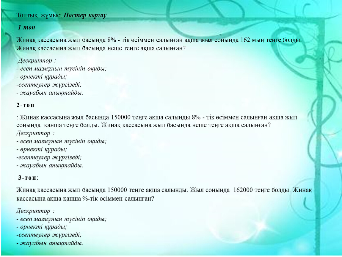 Топтық жұмыс; Постер қорғау |