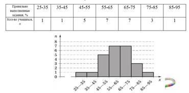 Используя интервальную таблицу частот можно результаты наблюдения представить в виде гистограммы. Гистограмма представляет собой ступенчатую фигуру, состоящую из прямоугольников. Ширину прямоугольников берут одинаковую- соотвествующую интервалам, их высоту –соотвествующую частоте ( в примере – числу детей) Алгоритм построения гистограммы 1. Отложить значения интервалов на оси ОХ 2. Отложить частоты на оси ОУ 3. Построить прямоугольники, ширина которых соответствует длине интервалов, отложенных на оси ОХ, длина – пропорциональна частоте соответствующего интервала. Пример 1: В таблице представлены проценты правильного выполнения тестовых заданий учащимися 8-го класса.