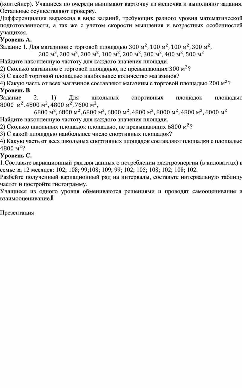 спортивных площадок составляют площадки с площадью Уровень С. 1.Составьте вариационный ряд для данных о потреблении электроэнергии (в киловаттах) в семье за 12 месяцев: 102; 108; 99;108; 109; 99; 102; 105; 108; 102; 108; 102. Разбейте полученный вариационный ряд на интервалы, составьте интервальную таблицу частот и постройте гистограмму. Учащиеся из одного уровня обмениваются решениями и проводят самооценивание и взаимооценивание. |