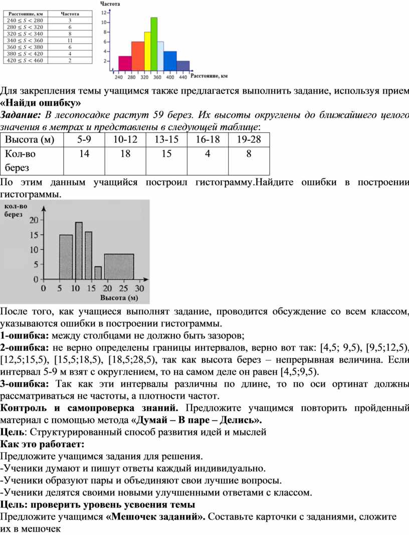 Для закрепления темы учащимся также предлагается выполнить задание, используя прием «Найди ошибку» Задание: В лесопосадке растут 59 берез. Их высоты округлены до ближайшего целого значения в метрах и представлены в следующей таблице: