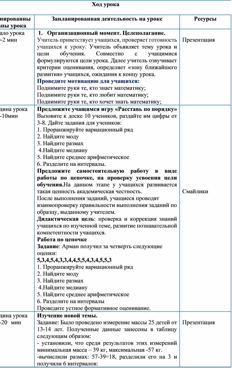 Предложите учащимся игру «Расставь по порядку» Вызовите к доске 10 учеников, раздайте им цифры от 3-8. Дайте задания для учеников: 1. Проранжируйте вариационный ряд 2. Найдите моду 3. Найдите размах 4.Найдите медиану 5. Найдите среднее арифметическое 6. Разделите на интервалы. Предложите самостоятельную работу в виде работы по цепочке, на проверку усвоения цели обучения.На данном этапе у учащихся развивается такая ценность академическая честность. После выполнения заданий, учащиеся проводят взаимопроверку правильности выполнения заданий по образцу, выданному учителем. Дидактическая цель: проверка и коррекция знаний учащихся по изученной теме, развитие познавательной компетентности учащихся. Работа по цепочке Задание: Арман получил за четверть следующие оценки: 5,3,4,5,4,3,3,4,4,5,5,4,3,4,5,5,3 1. Проранжируйте вариационный ряд 2. Найдите моду 3. Найдите размах 4.Найдите медиану 5. Найдите среднее арифметическое 6. Разделите на интервалы Проведите устное формативное оценивание. |
