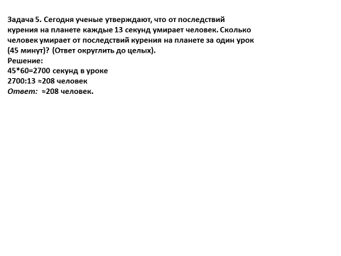 Задача 5. Сегодня ученые утверждают, что от последствий курения на планете каждые 13 секунд умирает человек. Сколько человек умирает от последствий курения на планете за один урок (45 минут)? (Ответ округлить до целых).