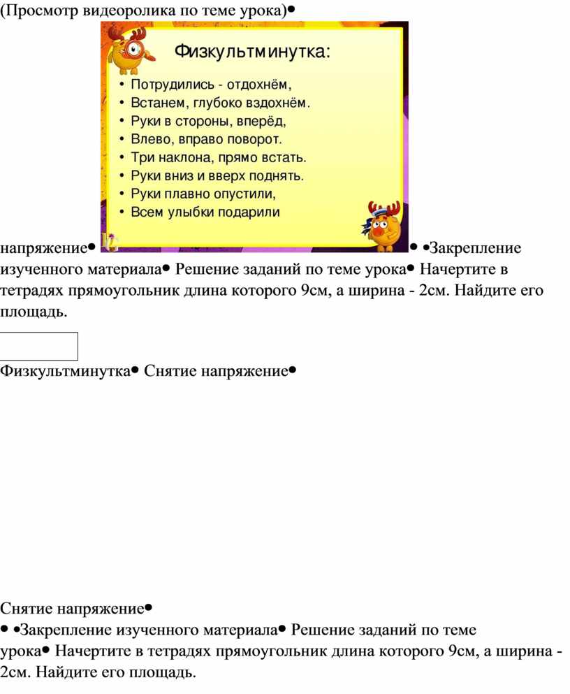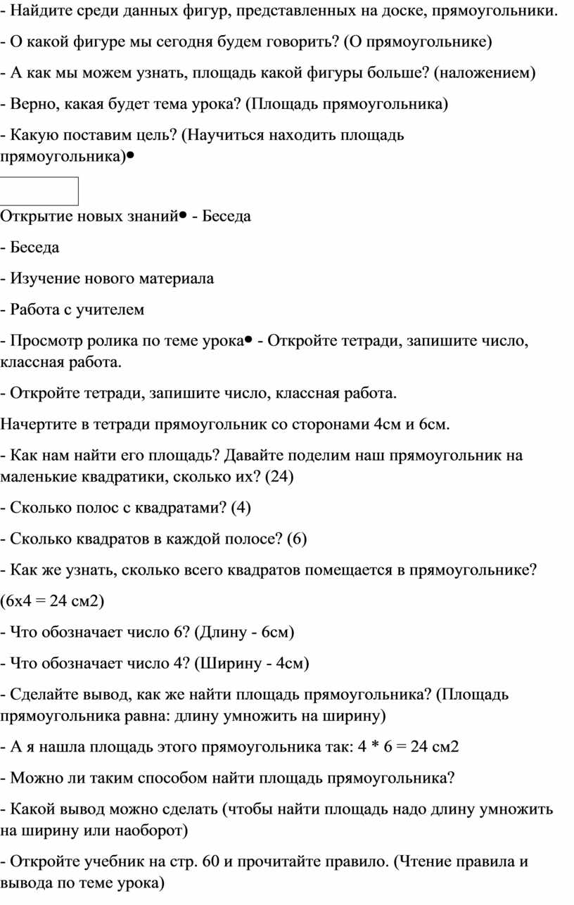 · Образовательные: актуализировать знание о геометрических фигурах; вывести правило вычисления площади прямоугольника; актуализировать знания таблицы умножения для вычисления.