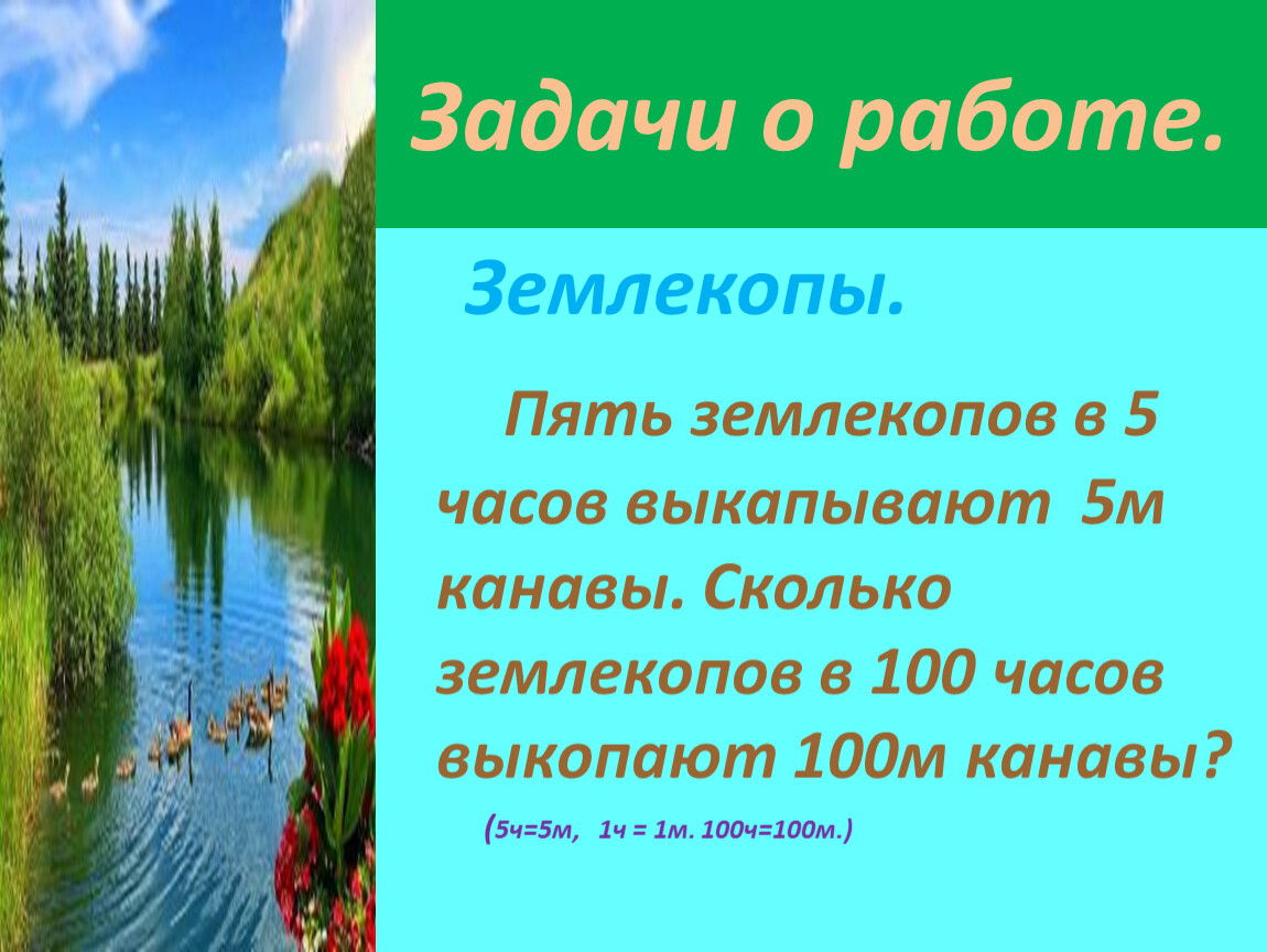 Пять землекопов в 5 часов выкапывают 5м канавы. Сколько землекопов в 100 часов выкопают 100м канавы?
