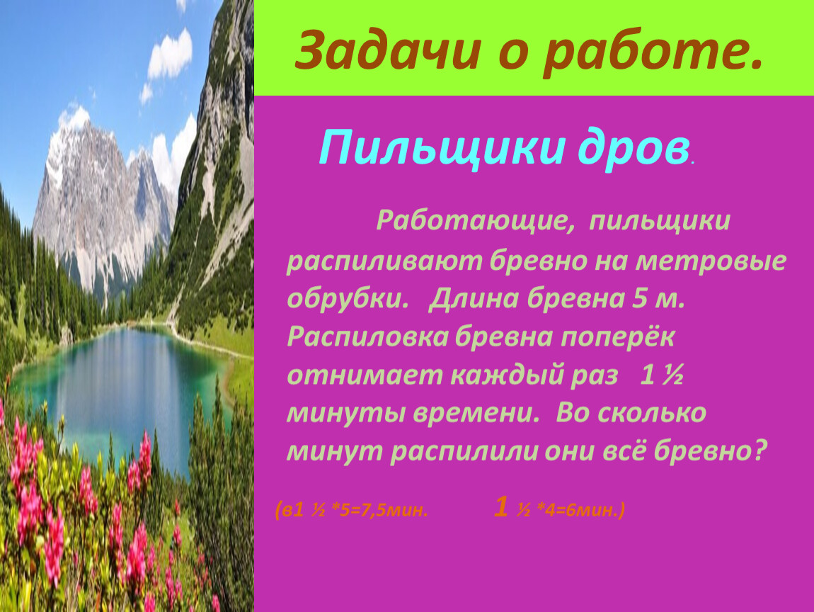 Работающие, пильщики распиливают бревно на метровые обрубки. Длина бревна 5 м. Распиловка бревна поперёк отнимает каждый раз 1 ½ минуты времени. Во сколько минут распилили они всё бревно?