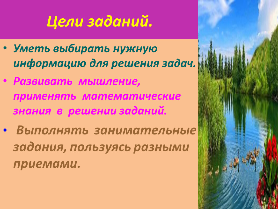 Развивать мышление, применять математические знания в решении заданий.