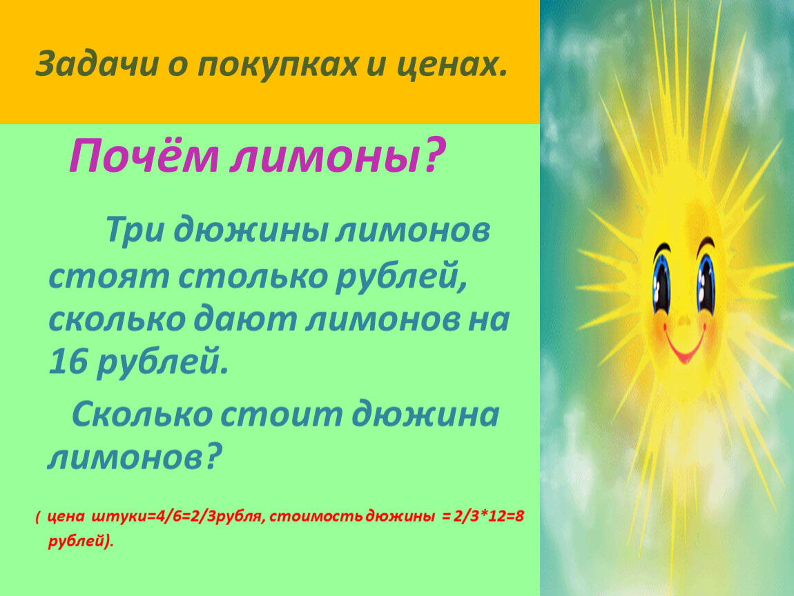 Три дюжины лимонов стоят столько рублей, сколько дают лимонов на 16 рублей.