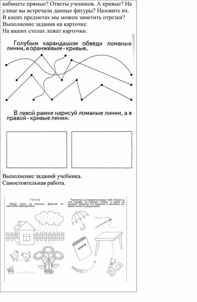 линий.) На ваших столах лежат геометрические фигуры. Какие фигуры вы видите? (Круг, прямоугольник) Работа в паре. Разложите все фигуры так, чтобы получилась прямая. А теперь разложите фигуры так, чтобы получилась кривая. Кто может показать на доске как из данных фигур можно сделать отрезок? В нашем мире существует множество точек, прямых, кривых, отрезков. Где в нашем кабинете находится точка? Смотрите как много в нашем кабинете точек. А скажите где в нашем кабинете прямые? Ответы учеников. А кривые? На улице вы встречали данные фигуры? Назовите их. В каких предметах мы можем заметить отрезки? Выполнение задания на карточке. На ваших столах лежат карточки.