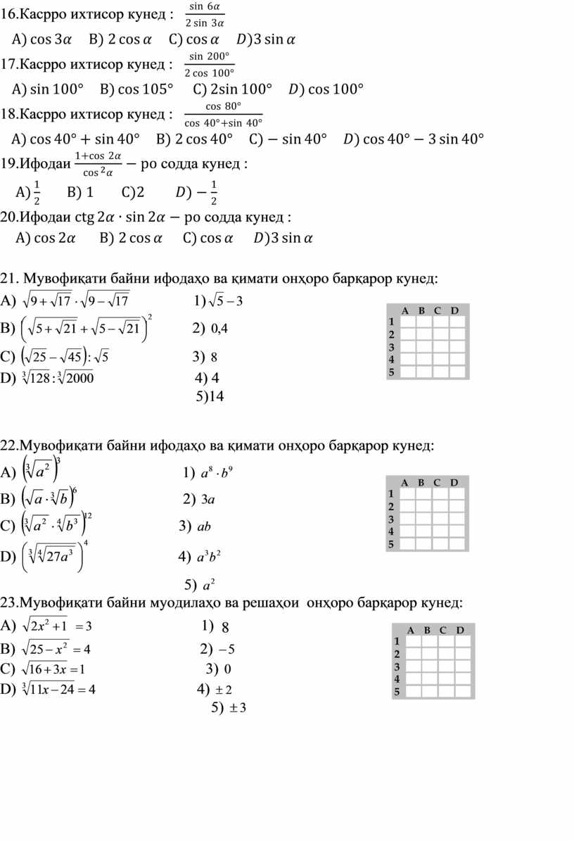 21. Мувофиқати байни ифодаҳо ва қимати онҳоро барқарор кунед: