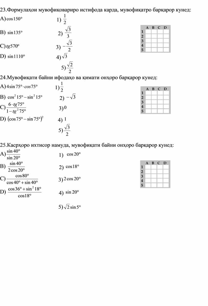 25.Мувофиқати байни ифодаҳо ва қимати онҳоро барқарор кунед:
