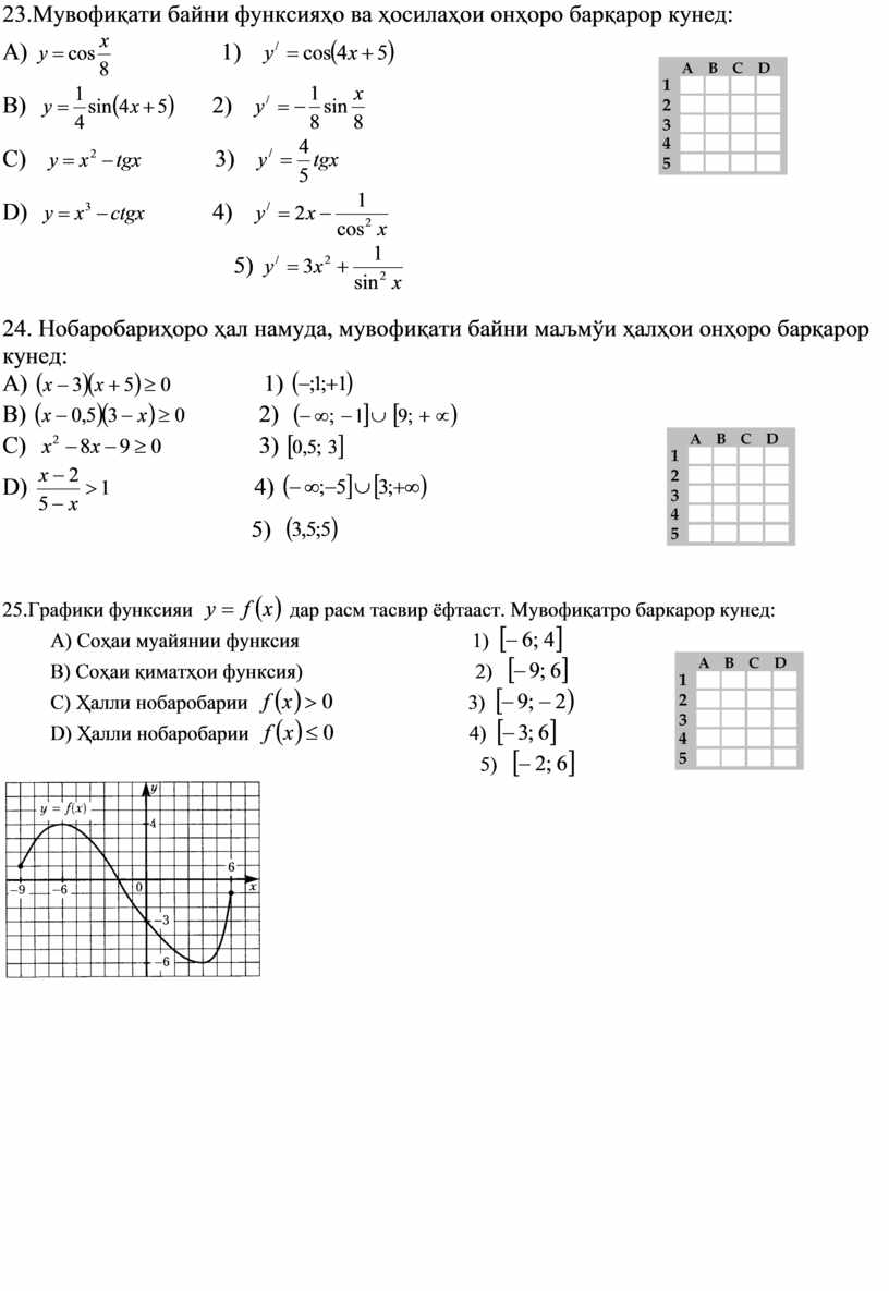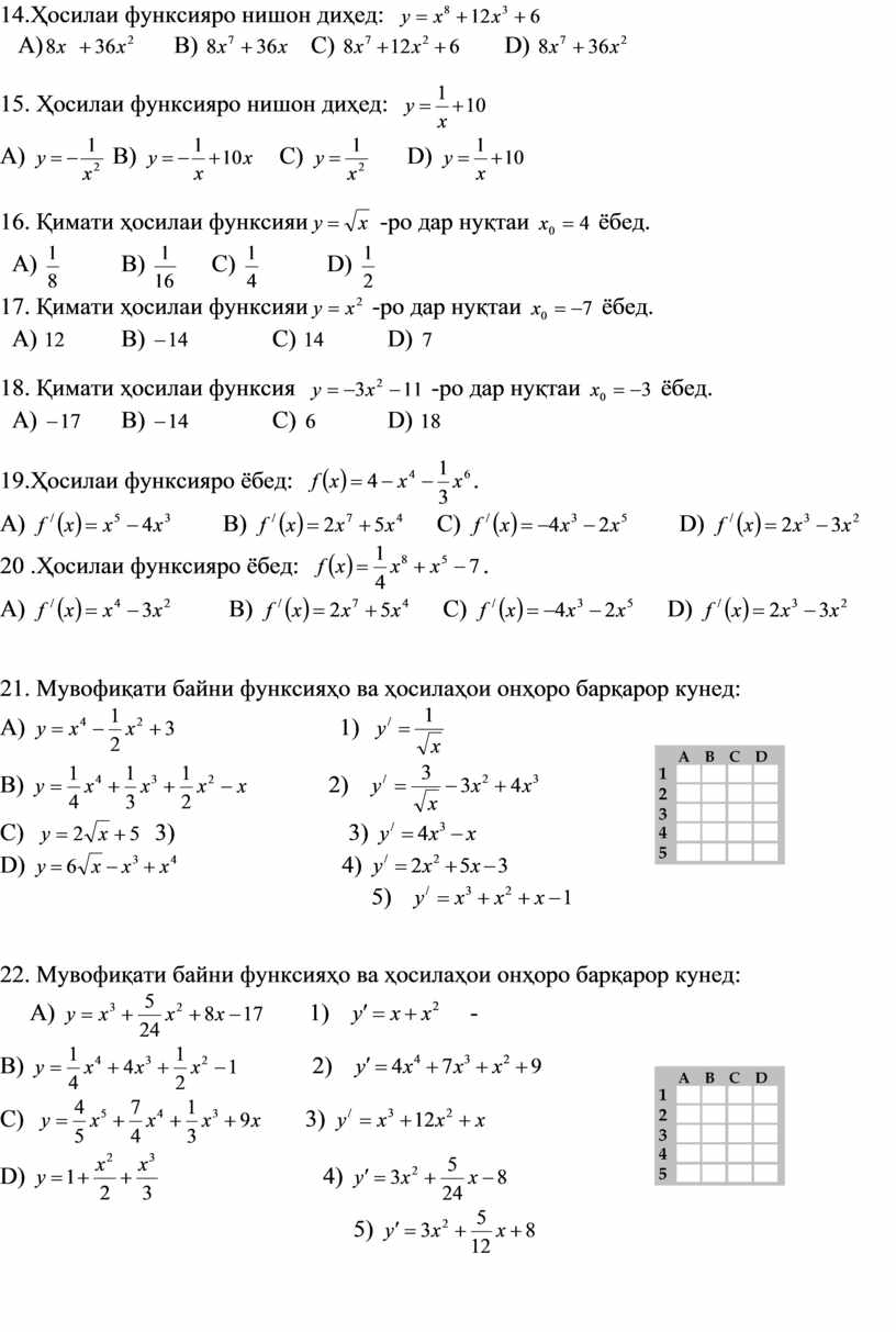 22. Мувофиқати байни функсияҳо ва ҳосилаҳои онҳоро барқарор кунед: