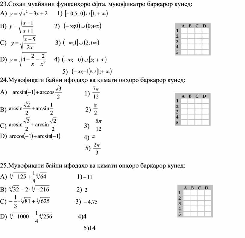 23.Соҳаи муайянии функсиҳоро ёфта, мувофиқатро барқарор кунед: