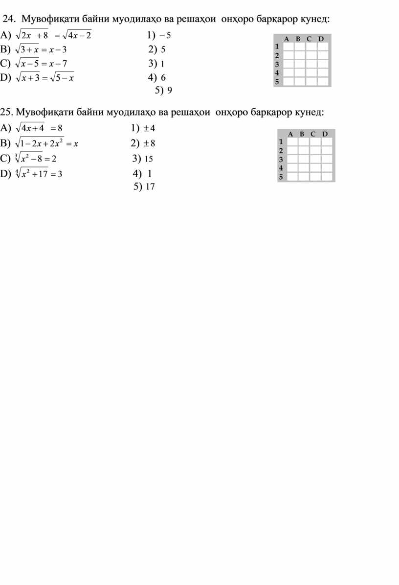 24. Мувофиқати байни муодилаҳо ва решаҳои онҳоро барқарор кунед: