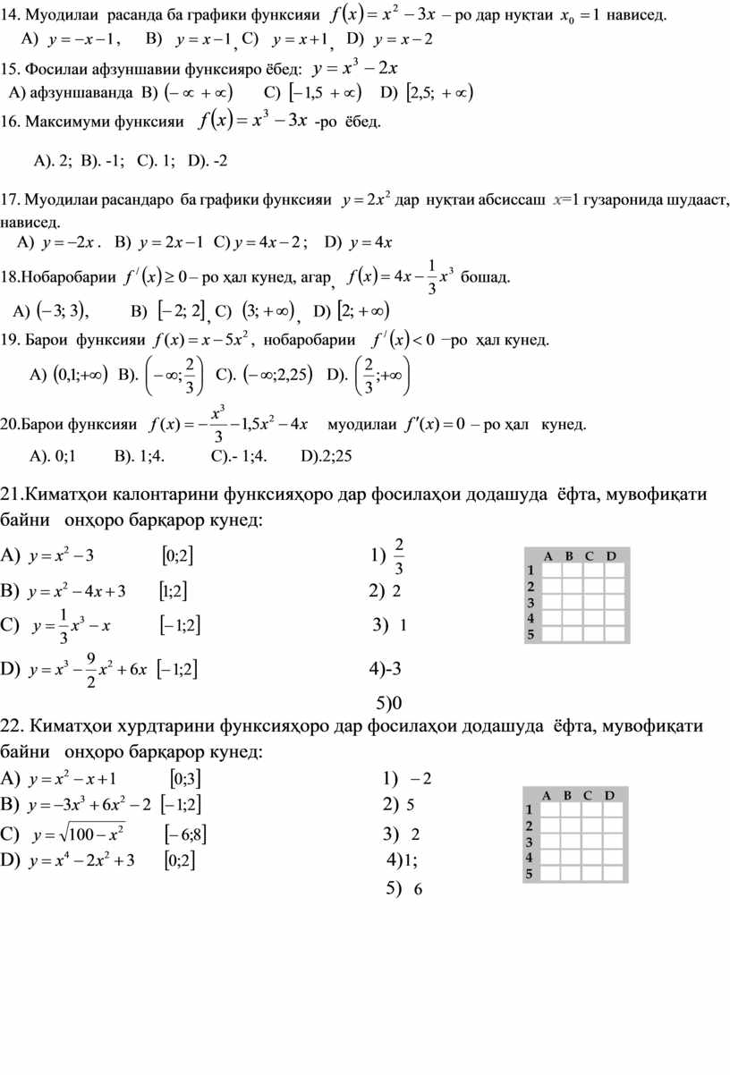 21.Киматҳои калонтарини функсияҳоро дар фосилаҳои додашуда ёфта, мувофиқати байни онҳоро барқарор кунед: