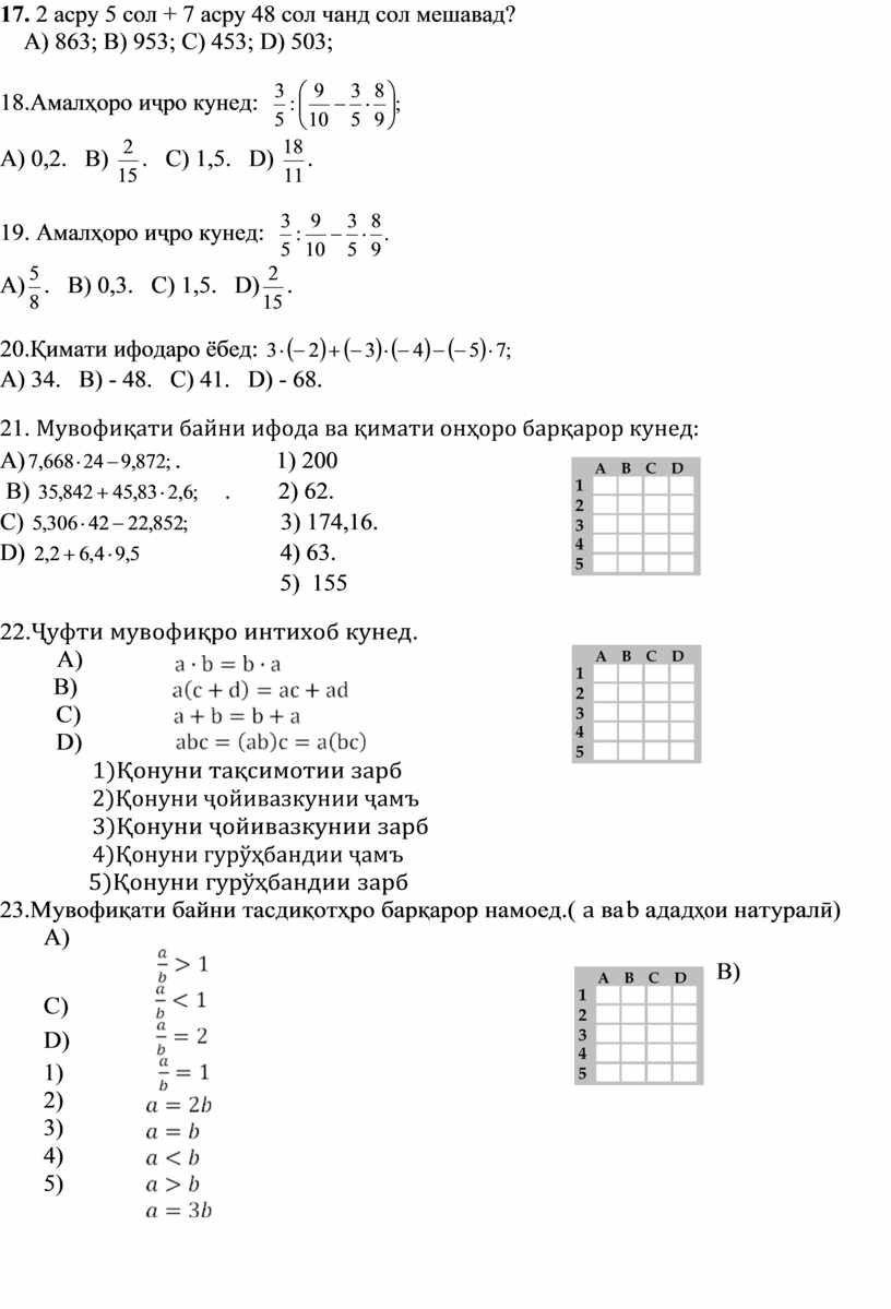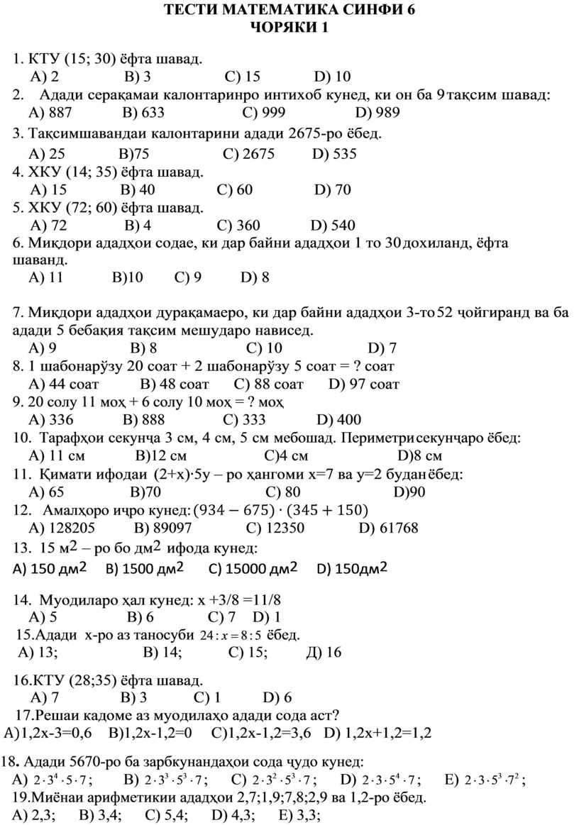 ТЕСТИ МАТЕМАТИКА СИНФИ 6