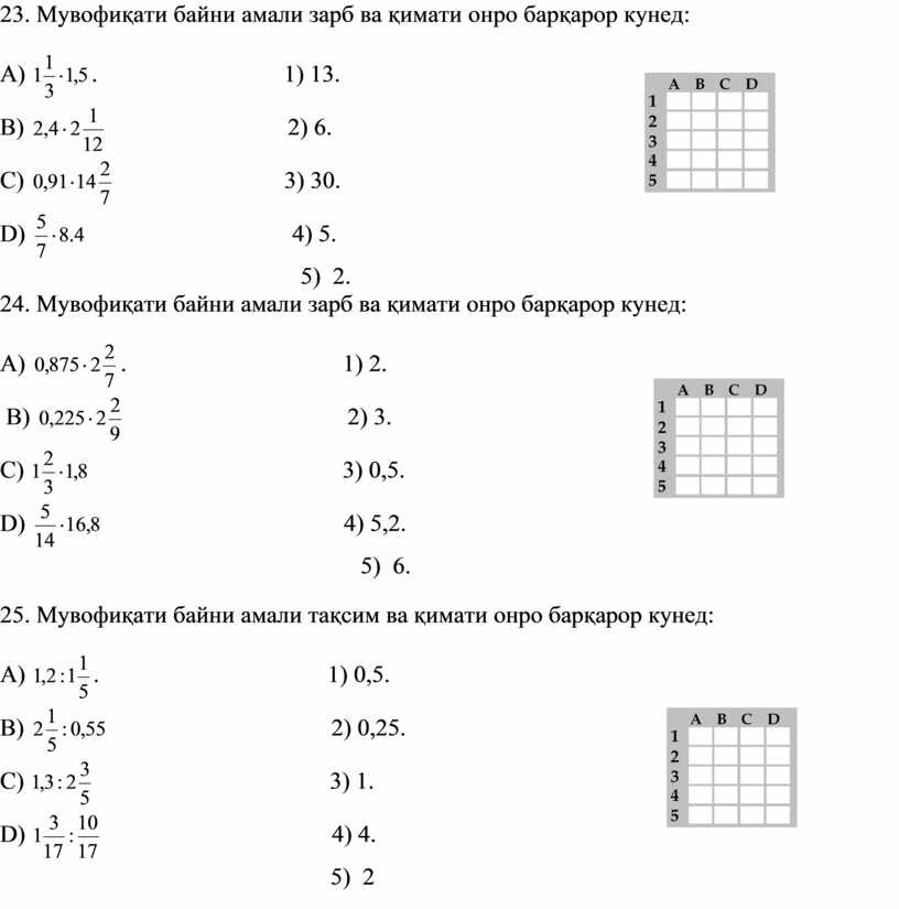 24. Ҷуфти мувофиқи ададҳо ва ҷавобҳои онро барқарор кунед.