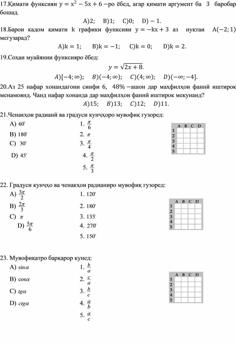 21.Ченакҳои радианӣ ва градуси кунҷҳоро мувофиқ гузоред: